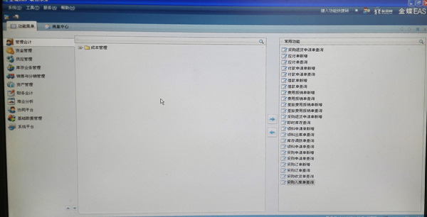 1、在輸入個人工號和密碼登陸EAS系統(tǒng)之后,先把自己經(jīng)常要用的功能添加到“功能菜單”的右邊“常用功能里(如領(lǐng)料申請單新增、領(lǐng)料申請單查詢、費用報銷單新增、費用報銷單查詢、庫存調(diào)撥單查詢等)以便于自己快速、準確地查看到單據(jù)狀態(tài)。