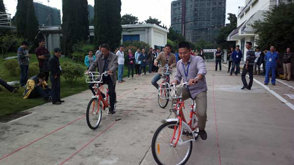 在9月29日上午舉行的慢騎自行車活動(dòng)中,稽查部的馬曉宇以2分17秒4的成績(jī)獲得了這個(gè)項(xiàng)目的第一。所謂的慢騎自行車即發(fā)出比賽指令后,參賽隊(duì)員支撐腳立即離地在長(zhǎng)45米、寬1米的賽道上進(jìn)行慢騎,當(dāng)自行車后輪壓在終點(diǎn)線時(shí),比賽結(jié)束。參賽選手在比賽中,身體任何部位不得觸及地面,車的前輪和后輪也不得觸及左右兩側(cè)的車道線,違者判失誤,以慢騎耗時(shí)時(shí)間最長(zhǎng)者為勝。
