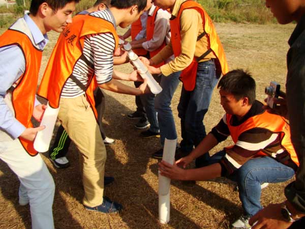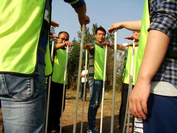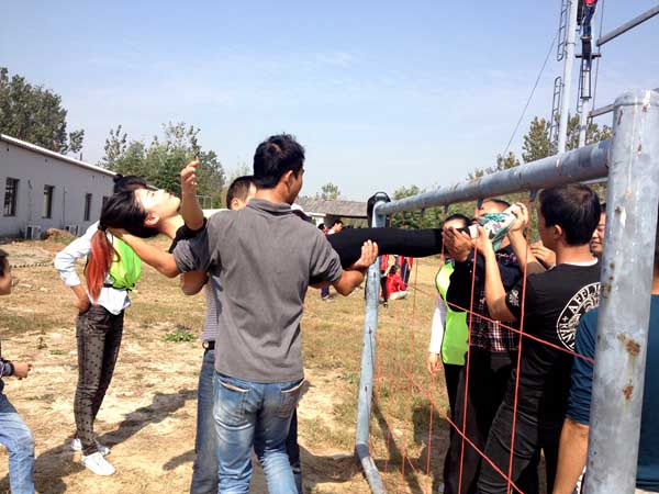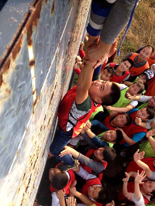 “求生墻”是要求五十多名隊員不借助任何的物品與工具,40分鐘內(nèi)翻越四米高的墻。這是一個經(jīng)典的團隊項目,考驗團隊合作能力、執(zhí)行能力和奉獻精神。在這個項目中,兩批員工均體現(xiàn)了奉獻、服從、合作意識,身材魁梧的甘當(dāng)人梯,臂力強健的墻頭援助。雖然規(guī)定了40分鐘,但是分工明確,行動迅速,兩批員工分別僅以21分鐘、19分鐘的時間全部翻墻求生墻,真正體現(xiàn)了團隊?wèi)?zhàn)無不勝的巨大力量。