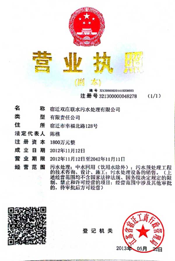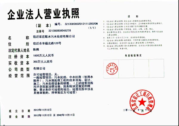 宿遷耿車(chē)污水處理有限公司、宿遷雙莊聯(lián)水污水處理有限公司為了更好的適應(yīng)社會(huì)環(huán)境的變化和工商總局的要求已于10月底將營(yíng)業(yè)執(zhí)照更換成新版營(yíng)業(yè)執(zhí)照。