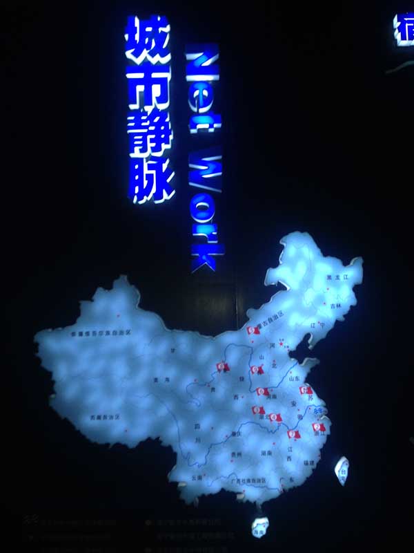 近幾年,集團(tuán)業(yè)務(wù)不斷發(fā)展壯大,項(xiàng)目公司遍地開花,而始建于2011年初的“城市靜脈”中的中國地圖所標(biāo)示出的5個項(xiàng)目點(diǎn)已無法完全展現(xiàn)集團(tuán)的蓬勃發(fā)展。此次宿遷公司重新設(shè)計了中國地圖,將集團(tuán)項(xiàng)目公司以紅旗形式標(biāo)注在燈箱顯示的中國地圖背景上,既使項(xiàng)目分布圖更加美觀、清晰、明了,又便于以后加注集團(tuán)新增項(xiàng)目。