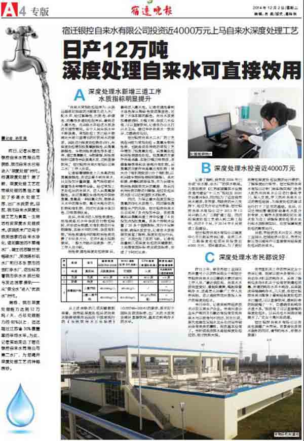 昨日上午,家住蘇宿工業(yè)園區(qū)蘇州壹號小區(qū)的鄭女士到宿遷市銀控自來水公司繳納水費時,好奇地問工作人員:“最近我發(fā)現(xiàn),自來水水質(zhì)明顯變好,看起來清爽,喝起來像純凈水,這是怎么回事?”工作人員告訴她,這正是我市花巨資投入生產(chǎn)出的深度處理水。