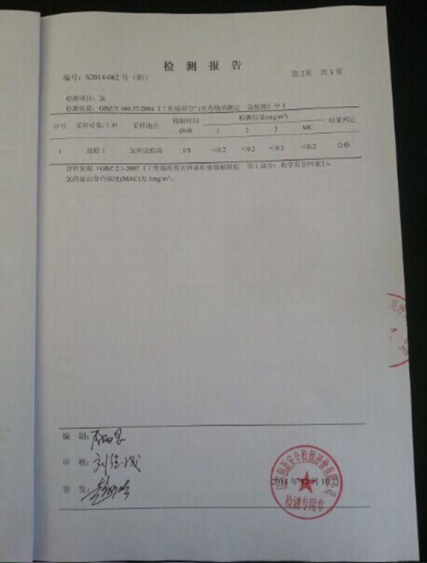 前不久,公司邀請第三方對一、二水廠的氯庫現(xiàn)場進行職業(yè)衛(wèi)生檢測,主要是對現(xiàn)場氯氣濃度進行檢測。經(jīng)過專業(yè)人員現(xiàn)場采樣,實驗后分析得出結(jié)論,一、二水廠現(xiàn)場氯氣濃度均小于0.2mg/m3,完全合格。也間接地驗證了公司在氯庫安全管理方面的成效。