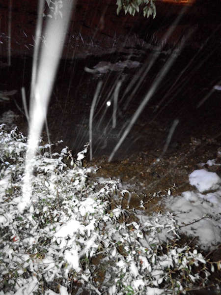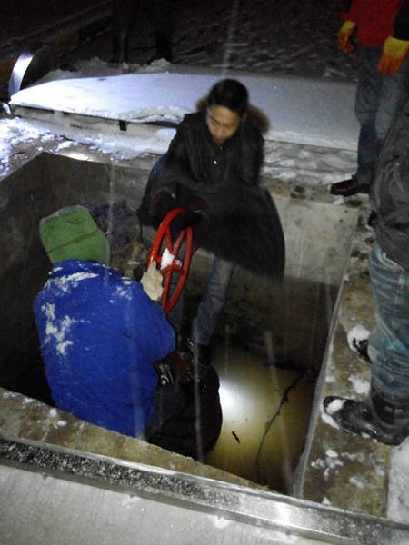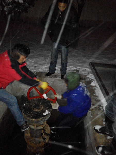 1月28日晚20時(shí)許,天空飄起了2015年的第一場(chǎng)雪,揚(yáng)揚(yáng)灑灑的雪花夾雜著凌冽的寒風(fēng)愈演愈烈,就在眾人窩在家中欣賞雪景的時(shí)候,殊不知,此刻有些人正頂著風(fēng)雪,沿線駱馬湖至雪峰公園路段開始巡管線,查漏點(diǎn)。