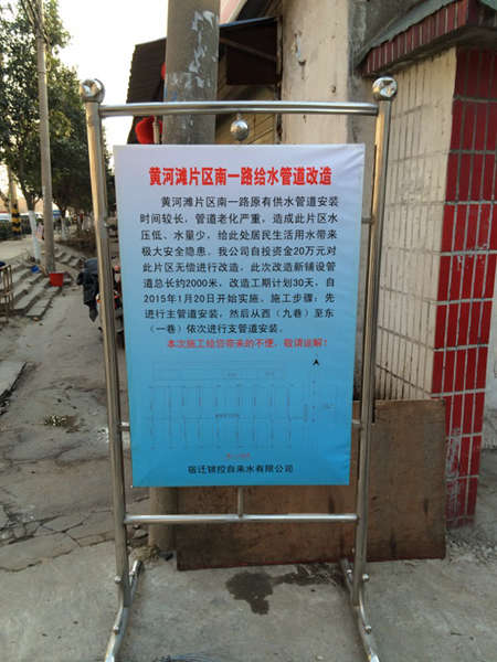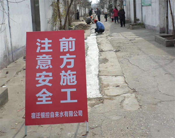 第一步從南一路供水管道開始改造,我公司自投資金20萬元對此片區(qū)無償進行改造。工程管理部接到此改造任務(wù)后,立即組織管理人員和施工人員查看現(xiàn)場,結(jié)合現(xiàn)場實際情況合理安排施工計劃。為做好宣傳工作,取得用戶的支持和諒解,也為了確保施工安全,工程管理部制作了施工告示牌放置在南一路主路口,在各支路口放置施工提示牌。工程自一月中旬開始實施,施工人員想方設(shè)法克服施工現(xiàn)場人流量較大、施工面較窄等困難,確保施工進度,現(xiàn)工程已完成三分之一。
