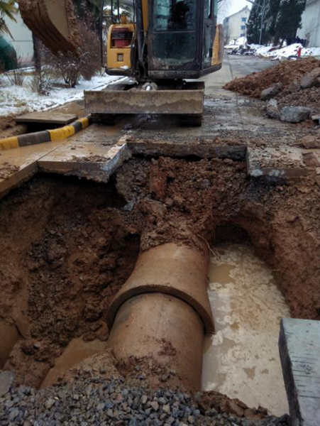 為了緩解供水壓力,同時(shí)為了減少因二次停水造成的不必要損失,公司決定同時(shí)搶修D(zhuǎn)N800原水管道兩處漏點(diǎn),一處位于雪峰公園東門附近,另一處位于一水廠制水部區(qū)域范圍內(nèi),此處漏點(diǎn)是27日發(fā)現(xiàn),28日查漏組定點(diǎn),29日制水部突然發(fā)現(xiàn)漏水明顯并確定DN800原水管道損壞。同一天需搶修兩處DN800管道,管網(wǎng)部的任務(wù)不但緊急而且艱巨。