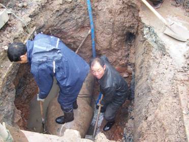 由于該處管道已長(zhǎng)達(dá)20多年之久,管道深達(dá)2米之多,同時(shí),管道東側(cè)還有新鋪設(shè)的DN800原水管道,地下管線復(fù)雜,無(wú)法進(jìn)行機(jī)械開挖。管網(wǎng)搶修人員只得借用工具一點(diǎn)一點(diǎn)地人工開挖。