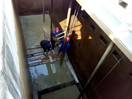 為了保證安全供水和維修的及時(shí)進(jìn)行,我們及時(shí)調(diào)整生產(chǎn),安排夜班人員保持清水池高水位,停止運(yùn)行一期沉淀池并進(jìn)行排空,在機(jī)電部準(zhǔn)備工作做好后,A組刮泥機(jī)已經(jīng)排空具備維修條件。