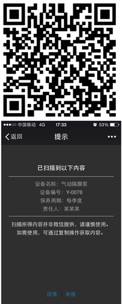 掃一下下面的二維碼,你會(huì)發(fā)現(xiàn)它能提供設(shè)備名稱、設(shè)備編號(hào)、保養(yǎng)周期、責(zé)任人等信息,當(dāng)然這只是一個(gè)樣本,相關(guān)人員可以根據(jù)需要,添加更多的信息在里面。