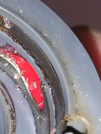 第二天巡檢時發(fā)現(xiàn)余氯分析儀再次出現(xiàn)故障,便將控制器和傳感器的電器連接部分全部檢查了一遍,并沒有發(fā)現(xiàn)問題,一時間有些無從下手,便停下來耐心排查線路,發(fā)現(xiàn)分析儀電流很大,達(dá)到兩百多微安,便懷疑是傳感器有問題,將傳感器拆下后仔細(xì)觀察才發(fā)現(xiàn),傳感器的電極之間有些非常難發(fā)現(xiàn)的磨損接觸。將接觸部分處理掉,進(jìn)行重新標(biāo)定,故障排除,儀表終于顯示正常。
