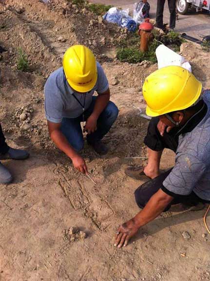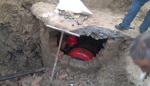 (圖為管網(wǎng)維修人員在狹小的操作坑內(nèi)進(jìn)行管網(wǎng)搶修)
