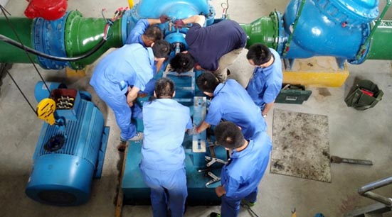 (圖為機(jī)電維修人員對(duì)送水泵進(jìn)行整體檢修)
