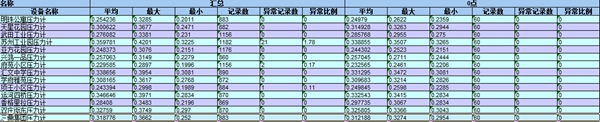 之前版本數(shù)據(jù)顯示的只是時間點(diǎn)的瞬時壓力,升級后的系統(tǒng)顯示出該時段內(nèi)的平均值、最大值、最小值,同時還統(tǒng)計出了記錄數(shù)、異常記錄數(shù)和異常比例,為準(zhǔn)確的判斷壓力點(diǎn)的壓力狀況,設(shè)備運(yùn)行狀態(tài)提供很大的方便。