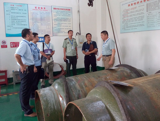 8月12日,“天津港”發(fā)生爆炸后,各級(jí)政府部門均加大了對(duì)“危化品”及安全生產(chǎn)的監(jiān)管力度。8月26日上午,江蘇省公安廳監(jiān)管總隊(duì)調(diào)研員薛建放、宿遷市公安局副局長李笑梅分別帶隊(duì)對(duì)宿遷公司一、二水廠進(jìn)行專項(xiàng)檢查。