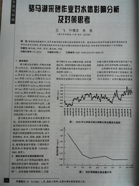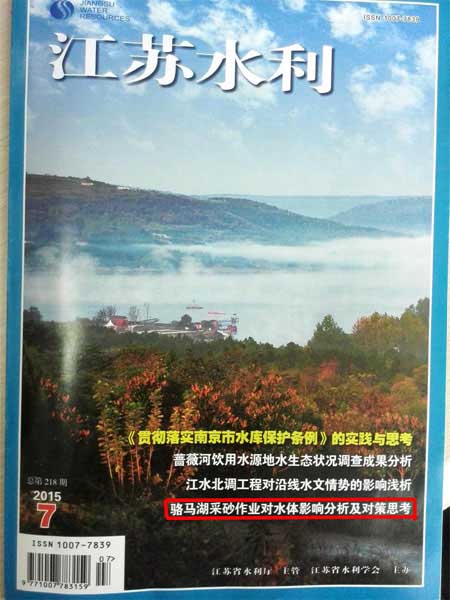 近期,宿遷公司水質(zhì)檢測中心經(jīng)理葉慎忠主筆的論文《駱馬湖采砂作業(yè)對水體影響分析及對策思考》刊登在《江蘇水利》2015年第7期,總第218期!督K水利》是江蘇省水利學(xué)會主辦,服務(wù)于江蘇水利現(xiàn)代化建設(shè)、以促進(jìn)水利事業(yè)發(fā)展、大力推進(jìn)水利科技進(jìn)步的刊物。