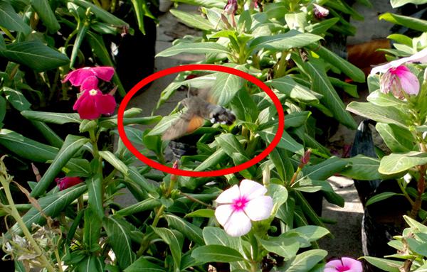 近日,在公司花叢中偶然發(fā)現(xiàn)一只罕見的“蜂鳥鷹蛾”,隨手拍照幾張!胺澍B鷹蛾”被稱為昆蟲世界里的“四不像”,像蝶,和蝶一樣白天活動(dòng),口器是長(zhǎng)長(zhǎng)的喙管,且有尖端膨大的觸角,還有色彩繽紛、美麗炫目的翅膀;它又像蜜蜂,在夏秋季節(jié)飛舞于百花叢中采食花蜜,并發(fā)出清晰可聞的嗡嗡聲;它還像南美洲的蜂鳥,夜伏晝出,很少休息,取食時(shí),和蜂鳥一樣,時(shí)而在花間盤旋,時(shí)而在花前疾馳,顧得此名。(圖1:花叢中的“蜂鳥鷹蛾”)
