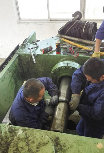板框壓濾機是污泥處理主要設(shè)備,為了不影響制水流程,機電設(shè)備部現(xiàn)場擬定大修方案,在沒有專業(yè)拆卸更換工具的條件下,機電設(shè)備部維修人員設(shè)法想法,攻克難關(guān),經(jīng)過兩天的共同努力,完成了板框壓濾機的大修工作。
