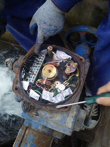 打開(kāi)閥門(mén)外罩,觀(guān)察到內(nèi)部電動(dòng)裝置線(xiàn)路存在銹蝕損壞現(xiàn)象,隨后,更換損壞原件,加入適量干燥劑,去除原有殘余密封膠,然后重新涂抹密封膠,蓋上罩殼,完成對(duì)閥門(mén)的維護(hù)。