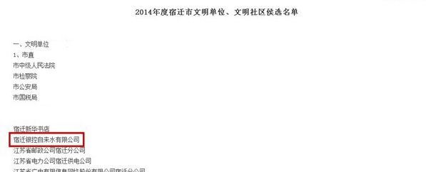 4月11日-13日,宿遷市文明辦對(duì)2014年度宿遷市“文明單位”進(jìn)行公示,宿遷銀控自來水有限公司上榜,近日,市文明辦將提請(qǐng)宿遷市委市政府對(duì)受表彰單位予以通報(bào)。