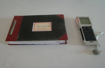 圖1:老式的“抄表本”和新式的振中牌TP900“抄表機”對比(一本表卡最多為250戶左右,而一部抄表機可同時存儲4000戶數(shù)據(jù),相當于18本表卡的數(shù)據(jù)量)