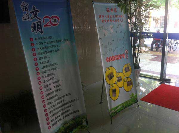 首先,加強氛圍營造。公司通過張貼海報、宣傳標語、制作宣傳欄、公司網(wǎng)站、微信平臺、LED屏等方式進行宣傳。如在營業(yè)大廳擺放我公司推行創(chuàng)文工作掠影,設置“做文明有禮宿遷人”簽名墻和“今天你文明了嗎?”曝光欄、1米線等;利用營業(yè)廳LED屏和電視分別播放文明20條標語和動畫,營業(yè)廳內和辦公區(qū)域張貼“禁止吸煙”等標示;公司綠化帶及外墻分別樹立和張貼“社會主義核心價值觀”標語,多方位宣傳營造了濃厚的文明氣氛。