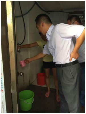 曾總一行首先來到黃莊村四組村民家中,向村民親切地詢問現在的用水情況。當地村民紛紛反映取自駱馬湖的自來水比之前用的井水好的多,曾總親自打開水龍頭查看水質、水壓情況,并向村民詳細地詢問目前公司在供水服務方面還存在哪些問題,同時,要求龍河區(qū)域供水服務中心主任宋衛(wèi)偉現場記錄,限時整改。