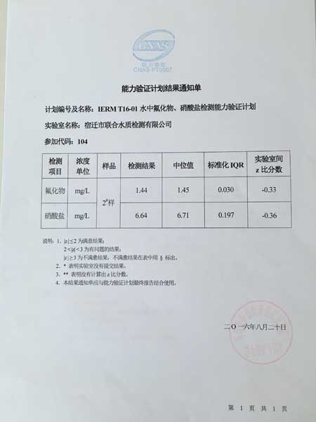 首批能力驗(yàn)證項(xiàng)目是水中氟化物、硝酸鹽的檢測(cè),經(jīng)過(guò)前期準(zhǔn)備,4月19日收到能力驗(yàn)證的樣品后,在規(guī)定的工作日時(shí)限內(nèi),順利地提交了檢測(cè)結(jié)果和有關(guān)資料。能力驗(yàn)證的結(jié)果,是按照與真值比較的偏差進(jìn)行計(jì)算分類,一般分為 “滿意結(jié)果”、“有問(wèn)題的結(jié)果”、“不滿意結(jié)果”三種。經(jīng)過(guò)幾個(gè)月的漫長(zhǎng)等待,終于于近日接到環(huán)保部的結(jié)果通知單,本次參加的檢測(cè)項(xiàng)目檢測(cè)評(píng)價(jià)結(jié)果為“滿意”。