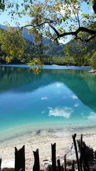 聽導(dǎo)游介紹九寨溝分三條溝:樹正溝、日則溝和則查洼溝,九寨溝景區(qū)呈Y字形,溝內(nèi)每個景點都有一個觀光車上下的車站。九寨溝里有許多數(shù)不清的湖,導(dǎo)游說當?shù)厝朔Q它們?yōu)椤昂W印保缂窈、熊貓海、五花海等等。一到目的地,就被眼前的風(fēng)景驚呆了!九寨溝里的湖水清澈見底,碧藍碧藍的,有許許多多可愛的魚兒自由自在地游來游去,透過清澈的湖水,可以看到斷裂的枯樹枝干交錯在湖底,煞是好看!真都不知道該用什么樣的詞語來形容它的美,再加上藍天上的朵朵白云映襯在水底,簡直是一幅美麗的圖畫。讓我們感到目不暇接,激動到大聲尖叫,趕緊拿出相機拍下這些難忘的勝景。