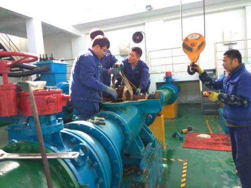 (圖:機(jī)電設(shè)備部維修人員正在吊起水泵軸)