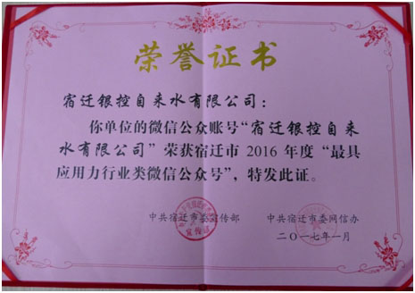 新年伊始,宿遷銀控自來水有限公司就迎來了“開門紅”。近日,公司微信公眾號“宿遷銀控自來水有限公司”被中共宿遷市委宣傳部、中共宿遷市委網(wǎng)信辦授予宿遷市2016年度“最具應(yīng)用力行業(yè)類微信公眾號”榮譽(yù)稱號。