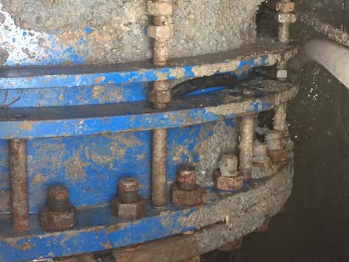為確保維修人員在井室內(nèi)正常操作,需將伸縮器管道內(nèi)現(xiàn)有水排空。請(qǐng)教管網(wǎng)部經(jīng)理后,大家共同確定了維修方案,并及時(shí)聯(lián)系生產(chǎn)廠家。3月12日,完成了墊片的更換工作,我們向廠家維修人員詢問(wèn)墊片滑脫的原因,維修人員告訴我們出現(xiàn)這樣的情況應(yīng)該是安裝時(shí)伸縮器的限位螺絲未擰到位導(dǎo)致。