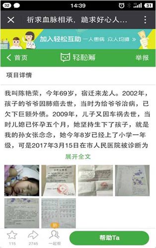 聽(tīng)父親說(shuō),隔壁四單元陳阿姨家的孫女得了白血病,當(dāng)時(shí)心里覺(jué)得沉甸甸的,著急忙慌地便去看望。陳阿姨今年近七十了,十年前老伴癌癥去世就欠下了巨額外債。“屋漏偏逢連夜雨”,沒(méi)想幾年前她的兒子又車(chē)禍離世,只剩下懷孕5個(gè)月的兒媳婦與她相依為命。四個(gè)月后她的孫女念念出生了,隨著念念一天天長(zhǎng)大,孩子也越來(lái)越懂事,學(xué)習(xí)成績(jī)也相當(dāng)不錯(cuò),一直到去年,孩子才知道自己的父親已不在人世,當(dāng)時(shí)就淚流滿(mǎn)面。陳阿姨這些年靠賣(mài)點(diǎn)煎餅和政府低保勉強(qiáng)度日,唯一欣慰的是兒媳孝順、孫女懂事,可沒(méi)成想,突如其來(lái)的白血病就像晴空霹靂讓他們雪上加霜。