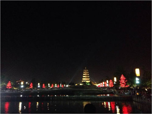 從回民街出來已經(jīng)是午夜時分,又因?yàn)槭锹糜瓮,所以我們一直吹著夜風(fēng)在西安城中晃蕩了許久才終于訂到了酒店。第二天養(yǎng)足了精神,我們準(zhǔn)備去游覽亞洲最大的音樂噴泉廣場-大雁塔音樂噴泉廣場。