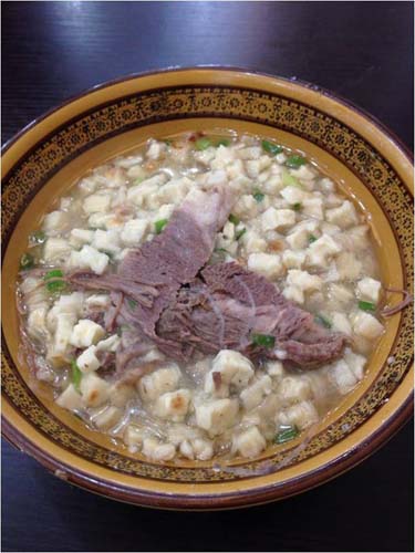 久負(fù)盛名的回民街就在鐘鼓樓廣場的不遠(yuǎn)處,我們正是饑腸轆轆的時候,正好可以到這個早已經(jīng)如雷貫耳的美食街上大快朵頤一番。陜西正宗肉夾饃、羊肉泡饃、秦正涼皮、岐山臊子面、大串的烤面筋,好像一時間自己的味蕾和嗅覺已經(jīng)完全不夠用了。第一次真正見識到西北人民粗獷豪邁的吃食,已經(jīng)來不及去感慨華夏幾千年來歷史給這片西北土地的豐厚饋贈了!從古老的建筑遺跡到傳承不歇的秦腔古調(diào),還有這些令人一想到名字都會覺得垂涎欲滴的美食。我們糾結(jié)于究竟要選擇哪一家美食很久,終于選定了一家賣羊肉泡饃的店,老板操著一口地道的關(guān)中方言給我們介紹店內(nèi)的美食,最終我們要了三碗羊肉泡饃和十串烤面筋。羊肉泡饃做得料重味醇,肉爛湯濃,肥而不膩?久娼钍窍憷庇形,入口酥脆。現(xiàn)在想來仍然覺得口水直流。