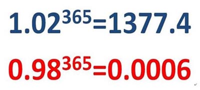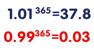 前兩天看到兩組算式,覺(jué)得特別勵(lì)志。算式分別是1.01的365次方等于37.8和0.99的365次方等于0.03。從數(shù)字上看,最初的原始數(shù)只不過(guò)差了0.02,但365次方后差別卻高達(dá)1260倍,而如果把這兩個(gè)數(shù)字再擴(kuò)大一倍,1.02的365次方后結(jié)果為1377.4,而0.98的365次方后的結(jié)果卻為0.0006,差距則為229.5萬(wàn)倍。數(shù)字始終只是一個(gè)數(shù)值,而這些數(shù)值恰能準(zhǔn)確地反映了人生。