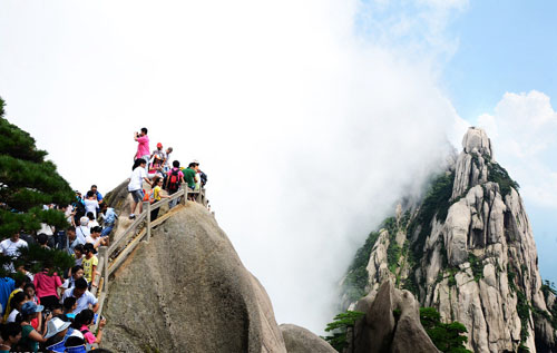 “無峰不石,無石不松,無松不奇”,沿路上導游的講解聲,鳥鳴聲,潺潺流水聲,歡笑聲匯成一片優(yōu)美的交響曲,在山間久久回蕩。長龍般的白衣紅帽起伏在蜿蜒的山間小路上,成為一道別致的景點,真不知是人點綴了山還是山映襯了人。