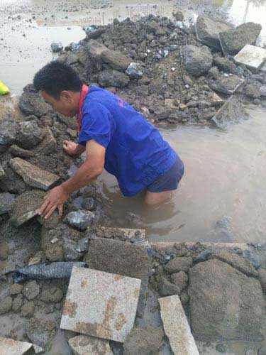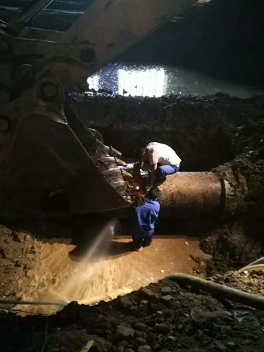 7月4日凌晨,經(jīng)過連續(xù)幾夜的排查,在關(guān)閉嶺橋村、二里村所有主控閥后,總表瞬時流量有了明顯的下降。大家分頭排查,終于在中揚鎮(zhèn)嶺橋村紅磚一組小橋頭發(fā)現(xiàn)一處PE160供水主管道接口處撕裂導(dǎo)致漏水,由于漏水點在河面水位以下,因此很難被發(fā)現(xiàn)。大家經(jīng)過簡單休息后,天一亮立即開始搶修,當(dāng)天室外溫度已經(jīng)達到34℃,維修員們頂著酷暑完成了搶修工作。目前平均夜間流量從之前的100噸降到80噸左右。
