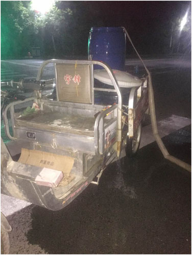 上周的一天晚上十點(diǎn)左右,我回家路上經(jīng)過雪峰公園,遠(yuǎn)遠(yuǎn)的看見雪峰公園東南角紅綠燈底下停了一輛裝滿桶罐的電動三輪車?赡艽蠹矣X得車停在紅綠燈底下并沒有什么特別的,可是作為在稽查部工作的一名員工,對于消防栓的位置多數(shù)悉知,而三輪車上的停靠位置正好在消防栓邊,加之車主在路邊抽煙不時抬頭看看車,以上種種情況顯示疑似私取消防栓偷盜水。