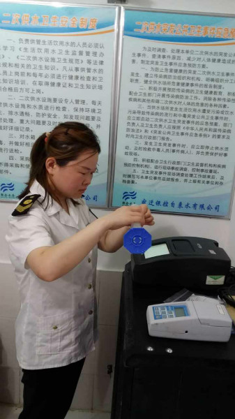 近日,宿遷市衛(wèi)生監(jiān)督局行政執(zhí)法大隊(duì)對我公司所管理的二次供水泵房進(jìn)行專項(xiàng)檢查。檢查內(nèi)容包括,二次供水所有涉水產(chǎn)品的衛(wèi)生許可批件、水箱清洗消毒記錄臺賬、泵房內(nèi)衛(wèi)生環(huán)境管理等方面,同時(shí)還現(xiàn)場取水檢測渾濁度、游離性余氯、PH值等。