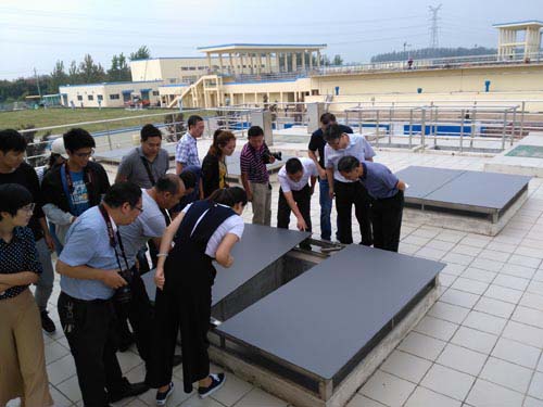 隨后,在宿遷銀控自來水有限公司總經(jīng)理助理趙軍的引導(dǎo)下,代表們實地參觀了制水工藝流程。在沉淀池上,沉淀后的清水通過不銹鋼集水槽進(jìn)入濾池引發(fā)了代表們的疑問。趙總介紹說,整個自來水處理工藝流程大致分為7個步驟,絮凝沉淀是非常重要的一環(huán),在絮凝池內(nèi)通過壓縮雙電層、電性中和、吸附架橋等作用將水中細(xì)小懸浮物聚集形成大的顆粒,進(jìn)而從水中分離沉淀,這就是為什么沉淀后的水比絮凝時的水干凈清澈的原因。在趙總的引導(dǎo)下,代表們順著制水工藝流程繼續(xù)參觀。過濾后的水通過濾池再進(jìn)行第二次臭氧處理、后臭氧處理流入活性炭濾池,這也是所謂的“深度處理”。趙總繼續(xù)介紹說,“深度處理”主要作用是破壞水中殘余臭氧、吸附化合物或臭氧副產(chǎn)物、降解水中有機(jī)物,從而讓水從“合格水”到“優(yōu)質(zhì)水”轉(zhuǎn)變,通過“深度處理”的自來水可以達(dá)到直接飲用的標(biāo)準(zhǔn)。制水工藝的實地參觀,讓代表們進(jìn)一步加深了制水工藝的認(rèn)知。在濾池下的直飲水處,代表們紛紛品嘗經(jīng)“深度處理”的后的自來水,不斷點頭稱贊。