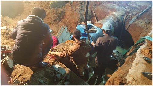 在趙總的指揮下,深夜10點半,緊張又忙碌的改造工作開始了。2.5萬噸的改造與1.5萬噸的改造有明顯的不同,連接管道由鋼管變成了鑄鐵管,原來的氧氣乙炔切割是達不到鑄鐵管道的熔點,需要切割機慢慢的切割才能完成,奈何管道壁厚太厚,直到晚上11點半依然沒有什么進展,F(xiàn)場,趙總、丁經(jīng)理帶領(lǐng)大家討論方案,確定使用焊機電焊點焊管壁讓局部溫度高于鑄鐵熔點,最終在凌晨0點30分終于完成了管道的切割。