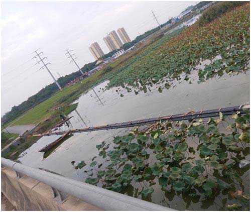 本次過(guò)河采用沉管工藝施工,先在河面搭造吸、排泥平臺(tái),將吸泥泵沉入水底開(kāi)槽,達(dá)到設(shè)計(jì)高程后再將焊接好的鋼管沉入溝槽內(nèi),完成沉管施工。