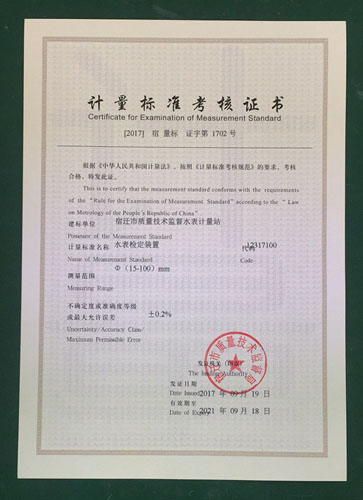 2017年12月12日,宿遷市質(zhì)量技術(shù)監(jiān)督局“建標(biāo)”考核組完成對(duì)水表檢定中心在用3套“水表檢定裝置”建標(biāo)復(fù)查考核,宿遷銀控自來(lái)水有限公司水表檢定中心取得在用《計(jì)量標(biāo)準(zhǔn)考核證書(shū)》。