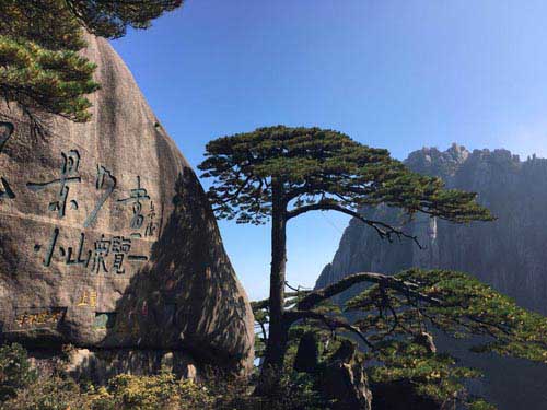 經(jīng)過不懈的努力,終于快到了終級目標(biāo)千年古樹——迎客松。不過值得一提的就是,去往迎客松的途中,會路過另外一顆比較有名的送客送,不過相較于迎客松,送客送就無人問津了,沒有多少人駐足留念,同樣是生長在同一座山上的古樹待遇差距咋就那么的大呢,我想,送客松也是這么想的吧,為了給它一個安慰,我決定為它拍一張照片,不過看過迎客松感覺送客松顏值真的遜色不少。唉,誰讓是“看臉”的時代呢。