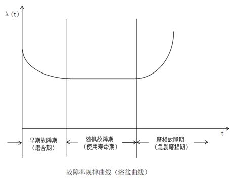 機械設(shè)備及其零部件自投入使用到損壞不能運轉(zhuǎn)的全部過程中,不同時間的故障機率是不同的。大量實踐表明,故障率與時間成“浴盆曲線”關(guān)系,如下圖: