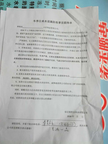 近日來(lái),天氣多變,氣溫持續(xù)走低。為了應(yīng)對(duì)此次寒潮天氣,宿遷公司組織人員于1月2日開(kāi)始前往重點(diǎn)小區(qū)(前期凍過(guò)及新建小區(qū))進(jìn)行地毯式巡查,對(duì)巡查中發(fā)現(xiàn)的水表井蓋破損、水表箱不密封、及時(shí)進(jìn)行修復(fù)并加強(qiáng)防護(hù)措施。對(duì)非重點(diǎn)小區(qū)也設(shè)置專人定點(diǎn)跟蹤,安排住在附近的員工作為巡查員,確保不發(fā)生問(wèn)題。同時(shí)請(qǐng)物業(yè)配合關(guān)閉管道井門窗,利用LED屏幕和喇叭向業(yè)主宣傳防凍知識(shí),使用戶提高意識(shí),配合防凍。