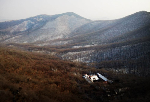 進(jìn)入景區(qū)立刻明白皇藏峪“峪”之意,沿著山谷主路步行而上,到達(dá)瑞云寺后路開(kāi)始變得陡峭,原本可以行車的路變成了石階和木質(zhì)棧道。寒冬時(shí)節(jié),整個(gè)山體顯得草木蕭疏,加上未完全消融的積雪,更加顯得蒼勁。因?yàn)榫皡^(qū)屬落葉闊葉林,是原始森林,千年古樹(shù)隨處可見(jiàn)。山上幾乎全是裸露的巖石,樹(shù)木從巖石縫間盤(pán)根錯(cuò)節(jié),青檀,南京椴這些長(zhǎng)達(dá)千年的樹(shù)木,盤(pán)虬臥龍,顯示出頑強(qiáng)的生命力。沿著階梯拾級(jí)而上,路過(guò)拔劍泉、皇藏洞這個(gè)主要景點(diǎn),都有著關(guān)于項(xiàng)羽和劉邦楚漢相爭(zhēng)的典故。最后到達(dá)海拔389米的平頂山觀景臺(tái),向下望去瑞云寺顯得的矚目,是整個(gè)山景的點(diǎn)睛之筆。