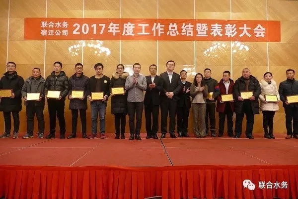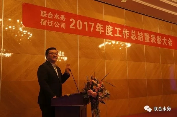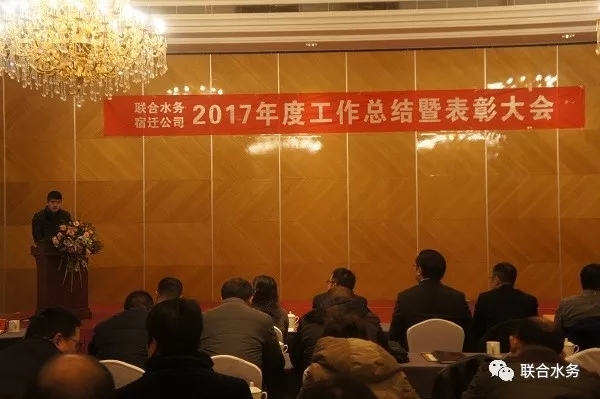 總結(jié)過去,展望未來,砥礪奮進(jìn),再譜華章。2018年2月10日上午,聯(lián)合水務(wù)集團(tuán)宿遷銀控自來水有限公司2017年度年終總結(jié)暨表彰大會(huì)隆重召開,聯(lián)合水務(wù)集團(tuán)供水業(yè)務(wù)副總裁劉猛先生、污水業(yè)務(wù)副總裁陳樵先生,財(cái)務(wù)總經(jīng)理陳國清先生、人事行政總監(jiān)楊麗霞女士、生產(chǎn)運(yùn)營總監(jiān)王歡先生以及宿遷銀控自來水有限公司、宿遷聯(lián)合市政工程有限公司、宿遷市民信水質(zhì)檢測有限公司、宿遷耿車污水處理有限公司、宿遷雙莊聯(lián)水污水處理有限公司主管以上人員、先進(jìn)員工、員工代表共計(jì)76人參加了會(huì)議,會(huì)議由宿遷銀控自來水有限公司副總經(jīng)理陳少軍主持。聯(lián)合水務(wù)集團(tuán)領(lǐng)導(dǎo)的親臨受到了大家的熱烈歡迎。
