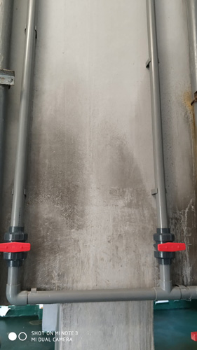此次改造機(jī)電設(shè)備部選用PVC防腐管材,減少不必要的彎頭數(shù)量,減小阻力;將兩個(gè)池子管道之間添加閥門,方便切換。為解決礬液倒流,在管道中添加了止回閥;取消了原先進(jìn)礬口,重新開洞,方便進(jìn)礬人員安裝進(jìn)礬管道。