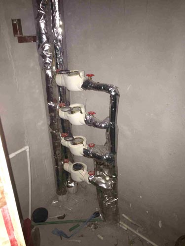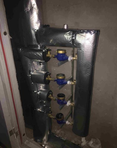 原有的立管、吊頂管保溫是根據(jù)已安裝的立管、吊頂管相鄰管道之間的間距來(lái)安裝保溫棉管,先用保溫棉管包裹管道,再用一層薄薄的鋁箔紙包裹保溫棉管。受間距所限此種保溫棉管厚度往往只有2cm或3cm厚,此種保溫棉管的保溫效果和外觀均不理想,也無(wú)法滿足省住房城鄉(xiāng)建設(shè)廳下發(fā)的關(guān)于加強(qiáng)全省建筑供水設(shè)施防凍保溫工作的通知中所要求的室內(nèi)供水管道保溫材料厚度不小于4cm的要求。而本次驗(yàn)收的兩個(gè)小區(qū)在立管、吊頂管保溫安裝之初就充分考慮了相鄰管道的間距,采用“3+1”或“2+2”分層包裹的方法保證保溫棉總厚度達(dá)到4cm。本次驗(yàn)收的兩個(gè)小區(qū)保溫棉管施工先使用2cm或3cm厚的保溫棉管包裹管道,后用一層2cm或1cm厚的鋁箔板進(jìn)行外包。既保證了保溫管的整體性和厚度要求,又在感官方面有了很大的改變。